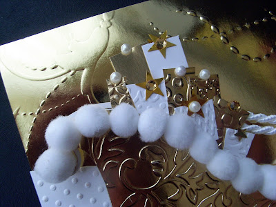 My card is A5 in size(8 1/2X11" folded in half) I covererd the front of the card with pre embossed gold mirricard which just has some embossed pattern over the right top side. I then cut two mound type shapes from white card which I cuttled with the Sizzix dots folder ( from the dots and flowers set it is nearly the same as CB Swiss Dots but the dots are a tiny bit bigger) for a snowy landscape. The sleigh is cut with my Cricut and Christmas Cheer cart @ 3 3/4 shadow in white, base and layer in gold mirri. I cut a couple more to adhere together to make it more dimensional. The top layer is cuttled with another of my new CB folders Victoria which I really like and will be using this one lots! I adhered white pom poms from Hobbycraft along the top of the sleigh and some white rope like cord also Hobbycraft in between the sandwiched pop dotted layers of the sleigh to look like reins. The presents are just hand cut little shapes which I embossed with little bits from the Christmas bauble A2 CB folder and the little embosser which comes in the CB snowman cut and emboss set. Added some gems, sequins and pearls. Some snowflake buttons in the top corner and the sentiment is from my stash and joined on the cord with gold jump rings. Phew I think that's all! This card was fun to make but a pain to photograph it is so shiny!
