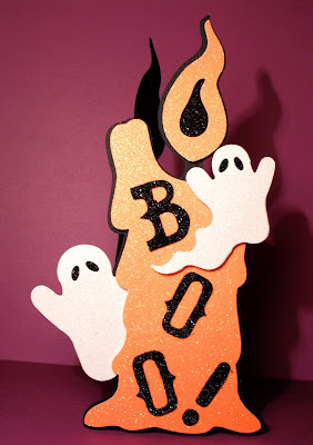 I made a shaped card using the candle in DS (which I am so happy to say is back up and running! I felt so lost without it and would like to thank Provo for getting me back up and running with DS so quickly! I emailed them and within a few days received an email with a new activation code. Great service!) My card is 7 3/4" tall and the card shape was cut in black card on shadow then another shadow in black .The base is cut from orange glitter card and pop dotted for dimension. The ghosts are a Sizzix die cut twice , once in white card and again in white glitter card. I sandwiched a small piece of black glitter card between my ghosts so that they have black sparkly eyes! and also some black glitter card behind the orange flame. The large ghost is sandwiched between the shadow and base layer of the candle and the smaller ghost pop dotted atop the candle.Finally BOO is cut from another Sizzix die in black glitter card.